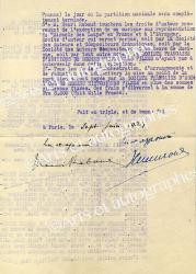SARMENT JeanLettre dactylographiée signée, adressée à M. A. Bloch. Paris, 30 octobre 1939 ; 3 pages in-4°. « Mon cher Ami. J’ai bien reçu, avec la lettre de M. Marcelle, les copies des deux lettres émanant de Liège et signées E. Déjardin et Ch. Liégeois, toutes deux relatives à la réclamation que L. Marchand et moi avons faite au sujet des droits d’auteur de L’Étoile. En tout cas, personnellement, je proteste formellement contre les assertions de M. Liégeois [...]. Je demande pour le principe et par égard même pour la Société des Auteurs que l’incident L’Étoile soit portée devant la Commission.»