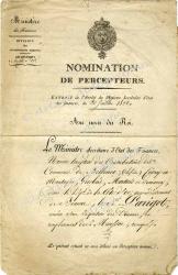 MINISTÈRE DES FINANCES.Pièce émanant du Ministère des Finances. Paris, 30 juillet 1822 ; 2 pages in-folio. En-tête du ministère des Finances et vignette aux armes royales : « Nomination de percepteurs ». Avis de nomination de M. Parigot au poste de percepteur des contributions pour les communes de Bellenot, Civry-en-Montagne, Grosbois, Martrois et Semaray dans le département de la Côte-d’Or, arrondissement de Beaune. « Il ne sera installé dans ses fonctions que lorsqu’il aura justifié du versement de son cautionnement, prêté serment d’être fidèle au Roi ».