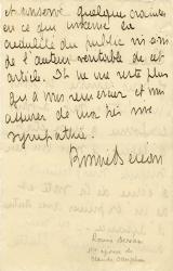 GANNE LouisLettre autographe signée, adressée à M. Everaerts. « 29 juin » ; 2 pages in-12. « J’apprends le terrible coup qui vous frappe et m’empresse de vous dire toute la part que je prends à votre deuil ! »