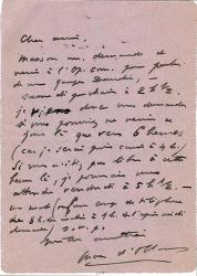 OLLONE Max d’ (Maximilien Paul Marie Félix, dit)Lettre autographe signée, adressée à Georges Favre. Paris, 27 novembre 1929 ; 1 page in-12, adresse autographe timbrée. « Masson me demande de venir à l’Op. Com. […] samedi prochain. […] Je viens donc vous demander si vous pourriez ne venir ce jour là que vers 6 heures […]. Un mot (ou un coup de téléphone de 8 h du matin à 1 h de l’après-midi demain) s.v.p. »