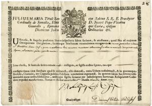 PASSARI Francesco SaverioPièce signée. 6 novembre 1800 ; 21,5 x 30,5 cm. Beau décor avec les armes épiscopales encadrant son nom en latin. Sceau aux armes sur papier en bas à gauche. Texte en latin.Diplome de lettres universitaires délivré à S. Bernardini.