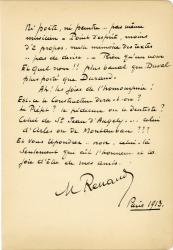 RENAUD MauricePièce autographe signée. Paris, 1913 ; 1 page in-12.« Ni poète, ni peintre … pas même musicien. Point d’esprit, moins d’à propos, nulle mémoire des textes … pas de devise — Rien qu’un nom Et quel nom !! Plus banal que Duval, plus porté que Durand. Ah ! les joies de l’homonyme ! Est-ce le constructeur dira-t-on ? le Préfet ? le pédicure ou le dentiste ? Celui de St Jean d’Angely …celui d’Arles ou de Montauban ??? Et vous répondrez ...non. Celui-là seulement qui eut l’honneur et la joie d’être de mes amis. »