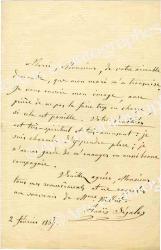 SÉGALAS Anaïs MénardLettre autographe signée, adressée à Charles Wallut. 2 février 1867 ; 1 page in-8°.« Merci, Monsieur, de votre aimable demande, que mon mari m’a transmise. Je vous envoie mon image, avec prière de ne pas la faire trop en charge, si cela est possible. Votre Panthéon est très spirituel et très amusant : je suis charmée d’y prendre place ; je n’aurai garde de m’ennuyer en aussi bonne compagnie. »
