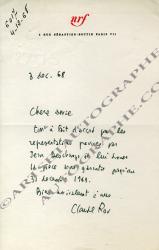 ROY ClaudeLettre autographe signée, adressée à Suzanne Arnoux. [4 décembre 1968] ; 1 page in-8°. En-tête de la NRF. « Tout à fait d’accord pour les représentations prévues par Jean Deschamps et lui donner la pièce sous garantie jusqu’au 31 décembre 1969 ».
