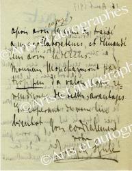 MEUNIER ConstantinLettre autographe signée, adressée au peintre Roll. [1891] ; 3 pages in-8°. « J’apprends une nouvelle qui me fait beaucoup de peine, mon ami Clory, le peintre militaire m’annonce que le tableau qu’il avait envoyé au Champ de Mars était refusé. Je tombe de mon haut car c’est un garçon de talent qui a conquis chez nous comme peintre militaire une place très honorable. Seriez-vous assez bon de vous déranger si cela vous est possible, pour tenter de savoir si il ne serait pas possible de faire revenir le jury où vous devez avoir des amis. C’est une toile d’assez grande dimension représentant une batterie gravissant une côte. »