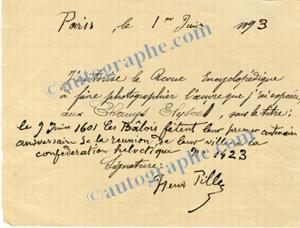 PILLE HenriBillet signé, avec 3 lignes autographes. Paris, le 1er juin 1893 ; 1 page in-16 oblongue. Il autorise la Revue Encyclopédique à photographier l’œuvre exposée aux Champs-Élysées, sous le titre : « Le 9 juin 1601, les Bâlois fêtent leur premier centenaire anniversaire de la réunion de leur ville à la confédération helvétique n° 1423. »