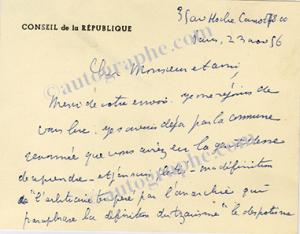 TORRÈS HenryCarte autographe signée, adressée à un ami écrivain. Paris, 23 novembre 1956 ; 1 page 1/2 in-12 oblongue. Sur papier à en-tête « Conseil de la République ». « Merci de votre envoi. je me réjouis de vous lire. Je savais déjà par la commune renommée que vous aviez eu la gentillesse de reprendre — et j’en suis très flatté — ma définition de l’arbitraire tempéré par l’anarchie qui paraphrase la définition du tzarisme, “le despotisme tempéré par l’assassinat”. Cela n’a pas changé. »