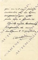 RENÉ Charles (Charles Olivier René Bibard, dit)Lettre autographe signée, adressée à Mlle Jeanne Le Bon. Paris, 6 février 1899 ; 2 pages in-12. « La Berceuse en question vient de paraître sous ce titre : Contemplations, chez Quinzard, éditeur à Paris, 24 rue des Capucines. »