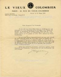 COPEAU JacquesLettre signée, adressée à M. La Chesnais. Paris, le 22 mars 1921 ; 1 page in-4°, en-tête du théâtre « Le Vieux Colombier ». « On me dit que vous êtes venu au théâtre pour me demander si vous pouviez faire publier à la Revue de Paris le manuscrit de Johan Bojer Les Yeux de l’Amour, dont vous êtes le traducteur, et que vous voudriez savoir si et quand la pièce doit passer au Vieux Colombier. Je ne vois aucun inconvénient à ce que cet ouvrage soit publié. Mais je n’ai pas, pour le moment du moins, l’intention de le représenter. Je l’ai lu il y a longtemps et je crois l’avoir conservé parmi ceux que je désire relire. »