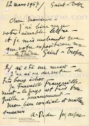 BARTET Julia (Jeanne-Julia Regnault, dite)Lettre autographe signée. Cannes, 2 mars 1923 ; 1 page 1/2 in-8°. « Un poème sur Thaïs a été envoyé au Gaulois ; Mlle Cécile Hubaine, l’auteur serait fière de le voir publier dans votre supplément. C’est une poésie exquise que j’ai eu la grande joie de dire plusieurs fois et qui a été hautement apprécié ». On joint un carte de visite autographe signée.