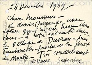 DUNOYER DE SEGONZAC AndréLettre autographe signée, adressée à M. Depas. 24 décembre 1969 ; 1 page in-12 oblongue, trous d’archivage.« Le dessin paysage avec église que j’ai vu hier chez vous a été exécuté dans le village de Davron près Feucherolles - proche de la forêt de Marly. Très cordialement à vous, Segonzac. »