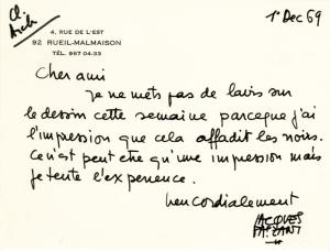 FAIZANT JacquesCarte autographe signée, adressée à Jean-Michel Royer. 1er décembre 1969 ; 1 page in16 oblongue .« Je ne mets pas de lavis sur le dessin cette semaine parce que j’ai l’impression que cela affadit les noirs. Ce n’est peut-être qu’une impression mais je tente l’expérience. »