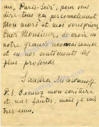 MILOWANOFF SandraLettre autographe signée, adressée au journaliste René Brest. Lundi 9 janvier 1939 ; 2 pages in-8°, enveloppe jointe. « Je ne trouve pas les mots pour vous remercier de votre article, —c’est en pleurant que je l’ai lu. Mille, mille fois merci, et croyez-moi que vos bonnes paroles dites sur moi, m’avait tellement touché, je ne les oublierai jamais. Un jour je ferai ma visite au Paris-Soir, pour vous dire tout ça personnellement. » Elle s’excuse ensuite pour ses fautes d’orthographe.