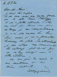 WEYGAND MaximeLettre autographe signée, adressée à Max Aghion. [Plou Jean], 18 août 1930 ; 1 page in-8°, sur papier bleu avec en relief « Coatamour, Plou Jean, Morlaix, Finistère ». « Je suis très confus de ne vous avoir encore remercié de votre Louis-Philippe. Il ma fallu attendre dêtre au vert pour trouver un peu de temps pour ma correspondance. Je nai pas encore lu le livre, mais je men promets beaucoup de joies. »