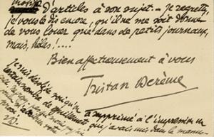 DERÈME TristanCarte autographe signée, adressée à Charles-Henry Hirsch. Cazères-sur-Garonne, 8 mai 1913 ; 2 pages in-32 oblongues. « Quel beau livre vous avez écrit et que je vous suis reconnaissant de lamabilité que vous avez mise à me le faire venir ! Voici un journal où vous trouverez un peu du bien que je pense de votre roman. [ ] Jentrevois déjà quelques motifs darticles à son sujet. Je regrette, je vous le dis encore, quil ne me soit donné de vous louer que dans de petits journaux, mais hélas ! ... »