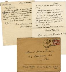 TERRASSE Claude AntoineEnsemble de 2 lettres autographes signées, adressées à A. de Fouquières. 5 juillet 1910 ; 1 page in-12. « Jai beaucoup regretté de navoir pu vous parler de laffaire dont mon ami vous a parlé. Voulez-vous me faire le plaisir daccepter à déjeuner un très prochain matin . Votre jour sera le mien ». Vierzon, 15 novembre 1914 ; 2 page in-12, avec enveloppe.« Je suis à Vierzon depuis une dizaine de jours auprès de mon second fils, blessé le 28 octobre dans lArgonne. Il est admirablement soigné et grâce à sa robuste constitution et à son grand désir de ne pas rester inactif il sera bientôt à même de quitter lhôpital » Il évoque ensuite un contrat pour une collaboration aux Folies Bergères.