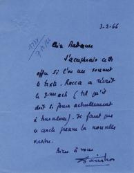 DANINOS PierreLettre autographe signée, adressée à Mme Arnoux de la Société des Auteurs et compositeurs. Paris, 3 février 1966 ; 1 page in-8°. « Jaccepterais cette offre si lon me soumet le texte. Rocca a récrit le 3è acte (tel quil doit se jouer actuellement à Barcelone). Il faut que ce cercle prenne la nouvelle version. »On joint 2 lettres signées dont lune, adressée au directeur des Trois Baudets, évoque son accord pour présenter en tournée ladaptation de son uvre Les Carnets du Major Thompson et lautre son accord « subordonné à celui de Robert Rocca » pour Un certain Monsieur Blot.Bon ensemble.