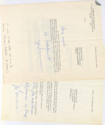 SAUGUET HenriContrat signé par Henri Sauguet, Claude Étienne, directeur du théâtre du Rideau de Bruxelles, et les héritiers de Jean Giraudoux. Bruxelles, 10 mai 1951 ; 2 pages in-4°. Contrat pour La Folle de Chaillot.