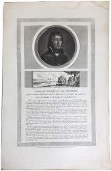 DESAIX Louis-Charles-AntoineBelle gravure, avec son portrait dans un cercle, gravée par Charles Francois Gabriel Levachez, avec une vignette gravée représentant sa mort à Marengo. Avec un texte biographique en dessous. XIXe siècle ; 47,5 x 30,5 cm, traces de mouillures dans la marge du haut. Mezzotinte dessinée et gravée par Jean Duplessis-Bertaux à partir de sa collection complète de 60 portraits des personnages qui ont le plus figurés dans la Révolution française.