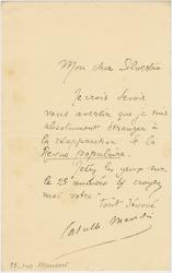 MENDÈS CatulleLettre autographe signée. Sans date ; 1 page in-8°. « Je crois devoir vous avertir que je suis absolument étranger à la réapparition de la Revue Populaire. Jetez les yeux sur le 2 e numéro. »