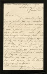 DURANTE FrancescoLettre autographe signée, adressée à un confrère. Letoianni, Messine, 8 juin 1881 ; 1 page in-8° sur papier de deuil, en français. « Je suis bien fâché de n'avoir pu m'occuper de vos souscriptions comme j'aurai voulu. Les deux deuils successifs de ma famille, mon épouse bien aimée et mon père et ensuite mon voyage en Sicile m'ont empêché de le faire. »