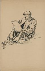 RENAULT AbelDessin au fusain. Homme assis en train de lire 37,5 x 24 cm. Cachet de l'atelier (18 rue de la salle à St Germain en Laye) au dos.