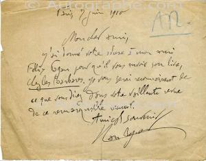 RYNER Han (Henri Ner, dit)Lettre autographe signée, adressée à un directeur de revue. Paris, 7 juin 1910 ; 1 page in-8° oblongue. Il a donné l’adresse de son correspondant à son ami Félix Fagan (?) pour qu’il lui envoie son livre Chez les barbares.