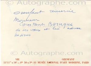 OZENFANT AmédéeCarte autographe signée, à la troisième personne, adressée au peintre Constant Baruque. Sans date ; 1 page in-12 au dos d’une photographie représentant son oeuvre Vie (Musée d’Art moderne de Paris). « Ozenfant remercie Monsieur Baruque de ses voeux et lui adresse les siens. »
