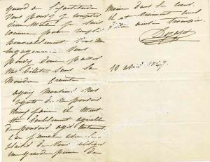 DÉJAZET Pauline VirginieLettre autographe signée. 10 avril 1847 ; 2 pages 1/2 in-8°. À propos d’engagements financiers. « Je suis connue pour remplir honorablement tous mes engagements. Vous pouvez donc passer mes billets sans la moindre crainte. Croyez, Monsieur, mes regrets de ne pouvoir mieux faire. Il m’eût été doublement agréable de pouvoir agir autrement. »