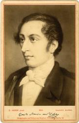 WEBER Carl Maria (Friedrich Ernst) vonPhotographie de son portrait réalisé par E. Hader. Format cabinet (16,5 x 11 cm). Photographie éditée par Sophus Wulliams, Berlin. Reproduction de la signature en bas du document.