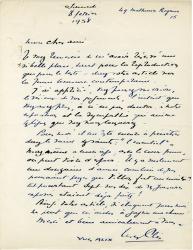 ALIX YvesLettre autographe signée, adressée au critique dart Georges Boudaille. Samedi 8 février 1958 ; 1 page in-4°. « Je vous remercie de mavoir réservé une si belle place; tant pour la reproduction que pour le texte, dans votre article sur la Jeune gravure contemporaine.Jai apprécié, vous pouvez me croire, le sérieux de vos jugements, lintérêt que vous avez pris, à nen pas douter, à notre exposition et la sympathie qui anime les lignes que vous nous consacrez.Pour moi, il me reste encore à pénétrer dans le saint des saints : lessentiel. Mais même à mon âge, avec le coeur jeune on peut vivre despoir. Il y a seulement une douzaine dannées combien de gens pouvaient penser que Villon fut un maître ? Et pourtant sept sur dix de ses gravures exposées étaient déjà faites ! Ainsi votre article, si éloquent pour moi ne peut que maider à gagner ma chance ! »