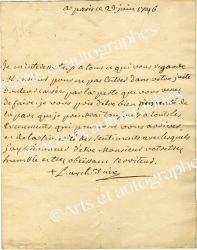 PRADHER Louis-BarthélémyLettre autographe signée. Paris, 3 juillet 1819 ; 1 page in-folio. Il demande : « de ne pas tarder à effectuer la promesse qu’elle daigna me faire hier, en l’assurant que je me glorifie autant de la protection dont elle m’honore, que de la grâce qui doit en être le résultat ». Signature suivie de ses titres et fonctions.