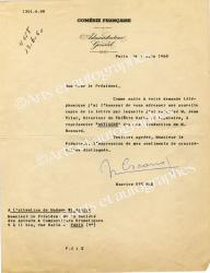 ESCANDE MauriceLettre signée, adressée à Mme Wildschitz. Paris, 9 juin 1960 ; 1 page in-4°. En-tête de la « Comédie française — Administrateur Général ». À la suite de sa demande téléphonique, il adresse une copie de la lettre « par laquelle j’ai autorisé M. Jean Vilar, directeur du Théâtre National Populaire, à représenter Antigone dans une traduction de M. Bonnard ».