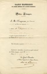 ORDRE DE SAINT-SYLVESTRE DE ROME.Imprimé de la grande chancellerie, signé par Charles Lebrun, duc de Plaisance, adressé à M. Chapuis. Paris, 24 novembre 1857 ; 1 page in-4°. En-tête imprimé « Grande Chancellerie de l’ordre impérial de la Légion d’honneur », cachet à sec de l’ordre impérial de la Légion d’honneur. M. Chapuis, chirurgien de marine, est nommé chevalier de l’ordre de Saint-Sylvestre de Rome. « Cette décoration est portée à la boutonnière. »