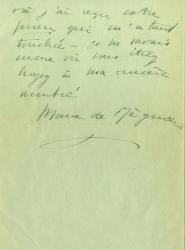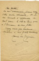 RÉGNIER Marie deLettre autographe signée adressée à un ami. 2 pages in-8°. Sans date ni lieu. Lettre amicale. « Merci du coeur en désordre. Je vous remercierai mieux si j’avais eu un exemplaire pour moi toute seule [...] Vous savez combien j’aime vos belles nouvelles et les relirai avec émotion. »