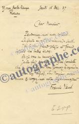 YARD Francis (Athanase François, dit)Lettre autographe signée, adressée à M. Diard. Jeudi 16 décembre 1937 ; 1 page in-8°. « Pardonnez-moi mon retard. La faute en est à la mauvaise santé. J’ai lu avec rand plaisir et grand intérêt vos belles études. […] Je les fais déposer au Lycée Corneille chez le concierge ou vous pouvez les reprendre ». Au dos il donne des renseignements sur des mots en patois normand.