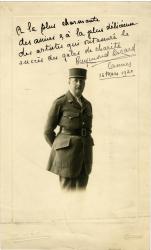 LAZARD RaymondPhotographie dédicacée à la cantatrice Andrée Vally. Cannes, le 16 mars 1920 ; 23 x 14 cm. « À la plus charmante des amies & à la plus délicieuse des artistes qui ont assuré le succès des galas de charité. Raymond Lazard. Cannes 16 mars 1920. »