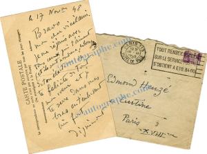DIGNIMONTCarte autographe signée, adressée à Edmond Heuzé. 17 novembre 1948 ; 90 x 140 mm, enveloppe jointe. « Bravo mon cher vieil ami. Je me réjouis avec tous ceux qui t’aiment (et ils sont nombreux les bougres !) de ton élection. Je te félicite de tout mon cœur et je te serre dans mes bras en t’embrassant bien fort. » Au dos de la carte représentant deux femmes dénudées sur le Pont des Arts, il écrit « Attention ! vois ce qui te guette sur le Pont des Arts ! cela va encore retarder mon portrait. »