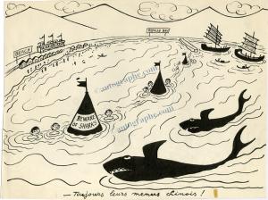 SENNEPEnsemble de 2 dessins :— « Le voyage de l’élite. » 185 X 285 mm. Légendé au dos. Scènes représentant deux touristes dans une pirogue.— « Toujours leurs menus chinois ! » 320 X 240 mm. Scène de requins tournant autour de nageurs chinois.