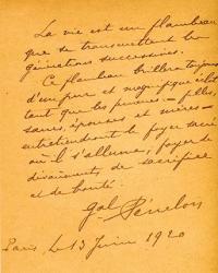 PENSÉES AUTOGRAPHES SIGNÉES.— CORPECHOT Lucien, journaliste et écrivain français. Sans date ; 1 page in-8°. Extrait du Jardin de l’Intelligence. « Le Nôtre n’a pas seulement marqué à Versailles la figure de son siècle, les grands traits de l’éloquence de Bossuet, la majesté de Louis XIV, mais il a tracé, à même notre terre l’image d’une France, éternellement en proie à la passion de l’intelligible...»On joint une autre pensée : « Ce qui est fait sans le secours du temps, ne lui résiste pas. »— PÉNELON, général, officier de liaison pendant une grande partie de la Première Guerre mondiale, secrétaire général militaire de la présidence. Paris, le 13 juin 1920 ; 1 page in-8°. « La vie est un flambeau que se transmettent les générations successives. Ce flambeau brillera toujours d’un pur et magnifique éclat tant que les femmes — filles, sœurs, épouses et mères — entretiendront le foyer sacré où il s’allume, foyer de dévouement, de sacrifice et de bonté. »