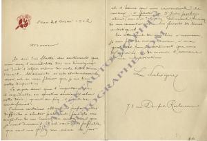 LEBÈGUE LéonLettre autographe signée, adressée à René Kieffer. Paris, 28 mai 1912 ; 2 pages in-8°. Avec son en-tête illustré à ses initiales. Il le remercie de sa lettre et des sentiments qu’il lui prodigue. « Le sujet ainsi que l’importance de l’aquarelle en question seraient selon votre désir ; quant au prix, il serait de cent francs. » Il lui demande de fixer lui-même la date de rendez-vous : « Ainsi, vous me trouverez sûrement heureux de vous rencontrer avec un fervent des livres artistiques ».