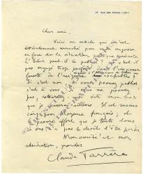 BARDONE GuyLettre autographe signée, adressée à Raymond Nacenta, directeur de la galerie Charpentier. Saint-Claude, le 26 janvier 1955 ; 1 page in-4°, trous d’archivage. « Devant présenter des toiles pour un concours, je me permets de vous demander si je pourrais prendre une des toiles que je vous avais laissées en dépôt. Mon camarade René Genis passera à la galerie, vendredi ou samedi, afin de prendre la peinture, si la chose est possible et vous la rapportera ensuite. »