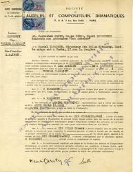 BERNSTEIN HenryPièce signée. Bruxelles, 13 juillet 1948 ; 2 pages in-4°. Traité signé entre Henry Bernstein, Jacques Deval et Lejeune et Gobert, directeurs du théâtre du Parc à Bruxelles (tous ont signés) pour représenter la pièce en trois actes intitulée La Route des Indes moyennant 10 % des recettes.
