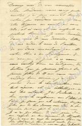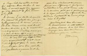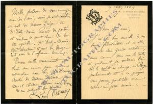 MEISSONIER ErnestLettre autographe signée. Sans date ; 3 pages in-12.« Plus j’y pense (excusez cette obstination de plaider ce qui va être exécuté) plus je trouve que cette souche de cerisier à 40 centimes du sol a de la valeur. Comme c’est la seule chose que j’espère invoque contre nous et que nous aurions pu depuis longtemps la faire disparaître, elle témoignera de notre bonne foi (?) que Renaud qui connaît nos moyens de plaidoiries voudra mettre en doute. Ensuite comme c’est vraiment la seule chose que l’expert affirme avec certitude nous pouvons affirmer que s’il avait pu être aussi certain de l’age réel des deux autres arbres qui sont au beau milieu de son tracé, il aurait aussi bien reconnu qu’il ne pouvait le faire comme il l’a fait.Le sureau d’un mètre cinquante n’a jamais été planté non plus que les deux ormes. Le sureau est le fils d’un sureau voisin aussi haut que ma maison et les 2 ormes sont venus de graines. D’autres ormes qui sont dans le même voisinage […] car ces arbres existaient avant le dernier changement. Vous m’avez dit que le […] surplus approximatif serait sans doute suffisant pour la cour.; mais dans l’espèce est ce bien possible et l’exactitude rigoureuse n’est elle pas bien absolument nécessaire puisqu’une différence de quelques centimètres à un point donné, celui de la maison peut par le prolongement de la ligne amener des différences de mètres à l’extrémité et causer plus ou moins de dégâts. Pardonnez moi mon cher ami le dernier ennui de cette lettre, la bonne chance et ce soir bon voyage avec mes meilleurs sentiments pour les vôtres. E. Meissonier. »