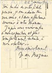 BAZAINE JeanCarte autographe signée au verso d’une carte représentant une de ses peintures, Chambre de musique [adressée à Bernard Dombrowski]. 26 janvier 1990 ; 150 x 105 mm. « Très touché de votre fidèle pensée, je vous adresse tous mes voeux et mon affectueux souvenir à votre maman. J’espère vous revoir enfin à mon exposition et plus tranquillement, ensuite, à mon atelier. »