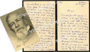 LAVEDAN HenriLettre autographe signée, adressée à un ami. « Loubressac, 6 sept. » ; 4 pages in-8° sur papier de deuil. « Je ne serais pas votre vrai ami si j’abusais de la vraie peine que m’a causée votre lettre pour augmenter la peine que vous ressentez de votre côté. Je ne doute pas une minute de la vérité et de la sincérité des raisons majeures qu’ont dicté votre conduite. Je plains de tout cœur la pauvre Madelon et je lui souhaite le plus prompt rétablissement. Cela dit, je ne puis vous cacher que le coup et la déconvenue ont été très durs à Mathilde. Elle se faisait avec moi une telle joie de votre présence et de votre séjour ici ! C'est avec cette idée qu’elle traversait vaille que vaille, depuis 3 mois et demi, tous ses ennuis... avec cette idée que je la remontais dès que je la voyais découragée. […] Pour l’avenir, je vous prie aussi et ici confidentiellement, de vous à moi, de ne pas prendre non plus “exactement au pied de la lettre” tout ce que dit Mathilde au sujet de ce pays du Lot. Si perdu qu’il soit, il y a ce qu’il faut, et d’excellents médecins qui viennent dans la journée, quelquefois plus vite qu’à Paris. Et de même, le voyage pour n’être pas celui de Paris à Versailles, est cependant praticable, vous le verrez. Ma vieille maman, qui est dans 85e année, l’a fait en pleines chaleurs de juillet, le jour ; son train par suite d’un déraillement sur une autre voie, a eu près de trois heures de retard ! et elle est arrivée aussi tranquille que si elle descendait de fiacre après une course de vingt minutes. »On joint une photographie dédicacée à Henri de Coussergues.
