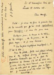 GAUTIER Jean-JacquesLettre autographe signée, adressée à Henry Müller, directeur littéraire de la revue Carrefour. Paris, 18 octobre 1948 ; 1 page in-8°, adresse au dos. « Voilà: je viens de finir le premier état de la nouvelle que j’ai écrite spécialement pour Carrefour, je veux dire pour vous. Quelque jours, le temps de la relire, de la corriger, de la poncer, de la faire taper ... je vous livrerai : “Que les gens simples sont compliqués !” (c’est le titre). Pour la photo, faites moi plaisir : adressez vous à M. Wilfrid Durry 61 avenue Franklin Roosevelt, qui en a fait très gentiment de bonnes (le n° de série est, chic de votre part de passer par ce type qui y trouvera peut-être ainsi un léger avantage) ».
