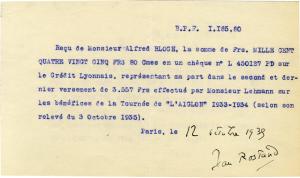 ROSTAND JeanPièce signée. Paris, 12 octobre 1935 ; 1 page in-12 oblongue.« Reçu de Monsieur Alfred Bloch la somme de mille cent quatre vingt cinq Frs […] représentant ma part dans le second et dernier versement de 3 557 frs effectué par Monsieur Lehmann sur les bénéfices de la tournée de L’Aiglon 1933-1934 (selon son relevé du 3 octobre 1935). »