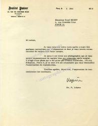 LEPINE PierreLettre signée, adressée au journaliste René Brest. Paris, 6 mai 1958 ; 1 page in-4°. En-tête de l’Institut Pasteur.« Je vous retourne votre texte après y avoir fait quelques corrections qui s’imposaient et dont je vous serais reconnaissante de vouloir bien tenir compte. Je joins à cet envoi une photographie que je vous serai bien obligé de me retourner après emploi. »