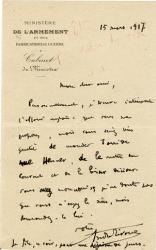 RIVOIRE AndréLettre autographe signée. 15 mars 1917 ; 1 page in-12. « Personnellement, je trouve intéressante laffaire anglaise que vous me proposez, mais vous seriez bien gentil de mander Tarride rue Henner, de le mettre au courant et de le laisser décider. Vous avez mon « oui », je ne doute pas que vous nayez le sien, mais demandez-le lui. ».